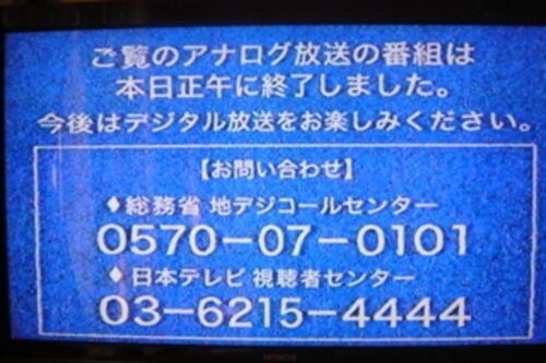 2011年7月24日正午 アナログ放送終了 画面の背景が青色に切り替わり、お知らせを表示 24時までには電波そのものが停止し「砂嵐」のような画面になる まだまだ先の話のようでしたけどあっけなく終わってしまいました 昨日までの涼しさはこの夏もうないのでし…