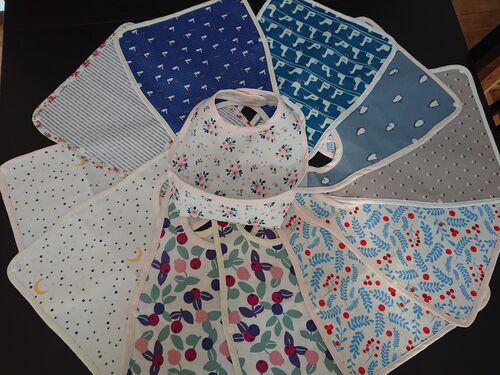 誕生日や結婚記念日だったからという訳ではありませんが いただきものが続いていますまず、孫のラミネートの食事エプロンの生地が残っていたので 使い切ってしまおうとたくさん作って娘に渡していたものが 娘婿の妹さんの赤ちゃんに使っていただけると何枚か…