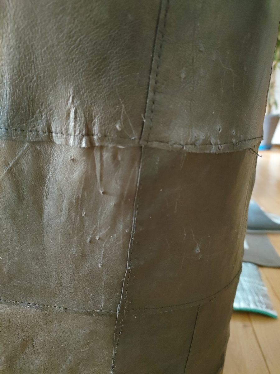 大きさ様々な皮のハギレをパッチワーク風につなぎ合わせて覆ってみた