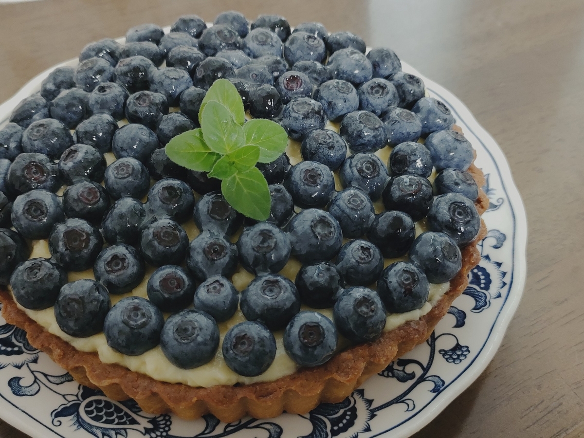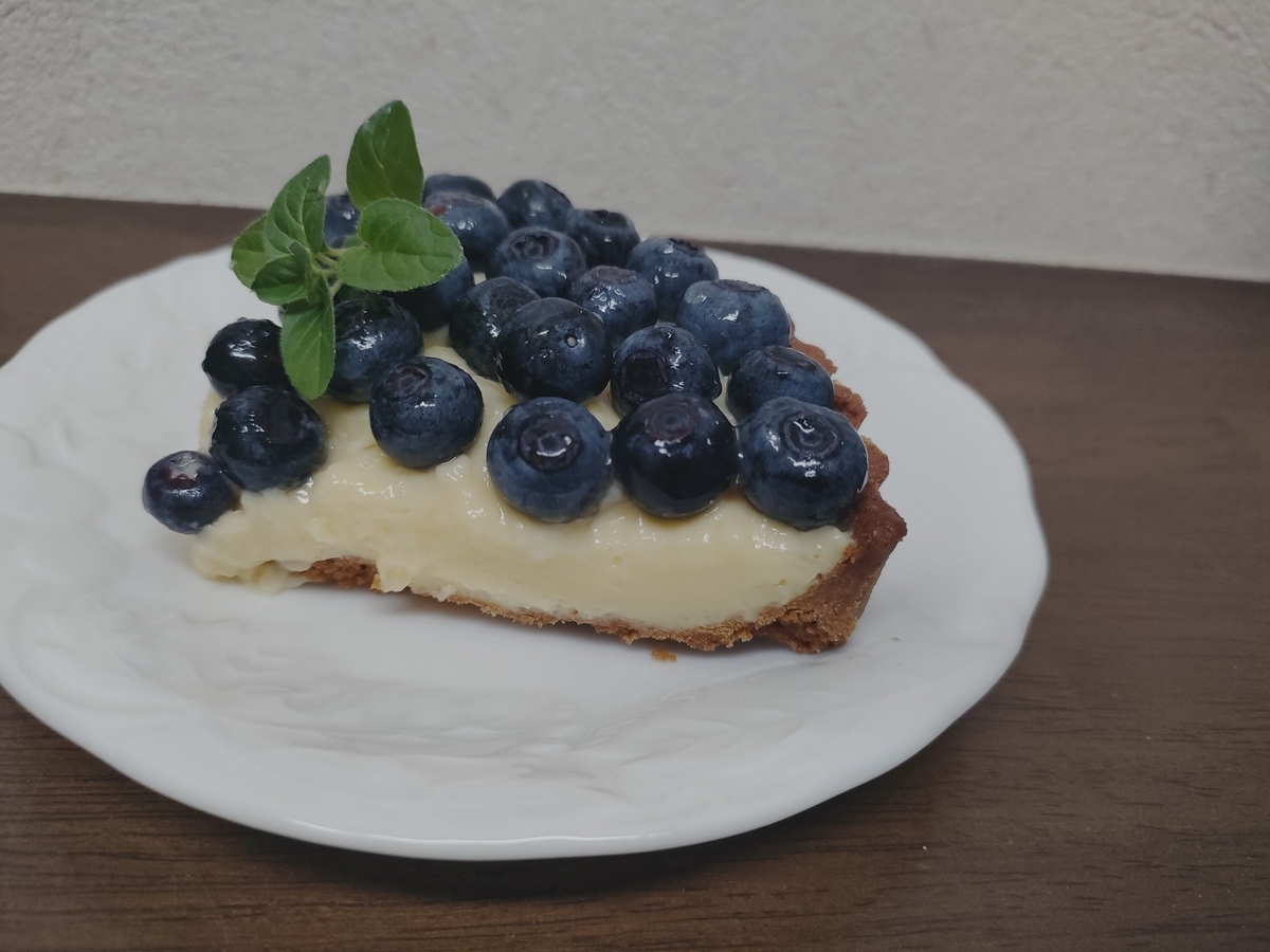 桃のタルトを作った時の残り 冷凍していたタルト生地を焼き、カスタードクリームを手作りしブルーベリータルトを作りました