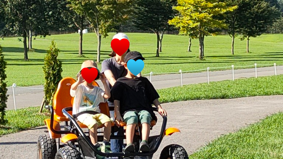 食べたあとは牛を見たり、ファームパトロールというペダルをこぐカートに乗ったり、遊具で遊んだり、炎天下なのに底なしの子どもたちのパワーにこちらは息切れ状態