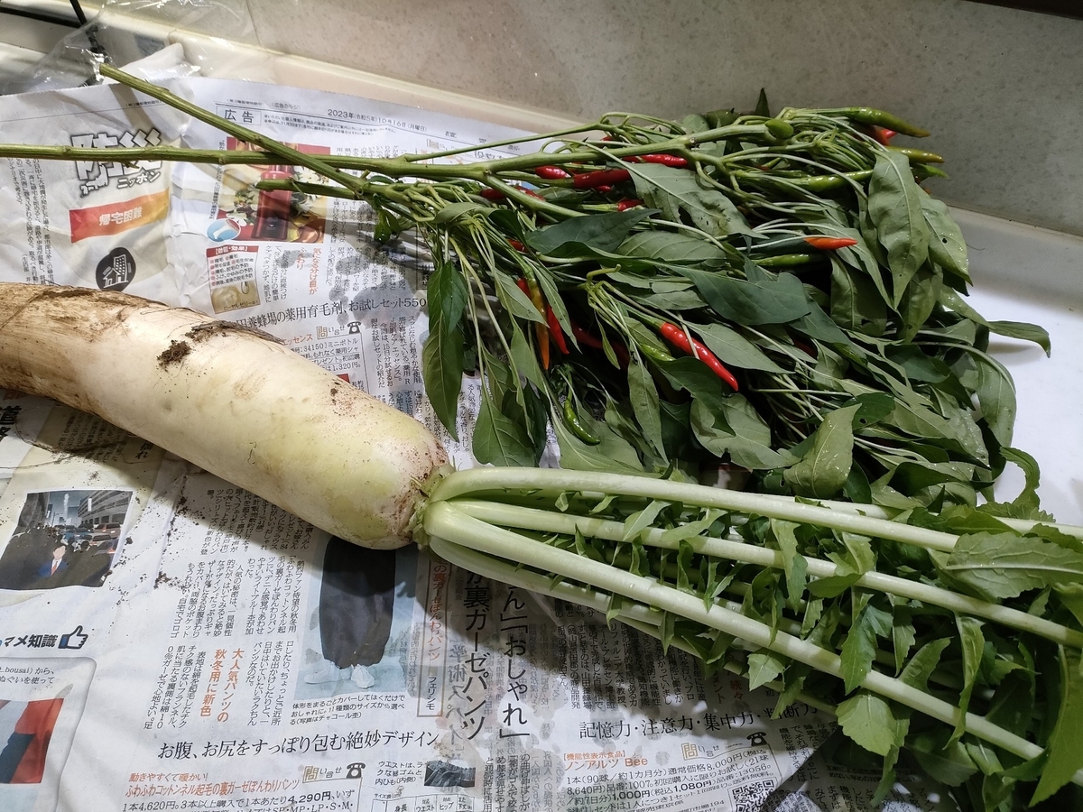 いつもお野菜をくださるご近所さんから唐辛子と一緒に大根をいただきました