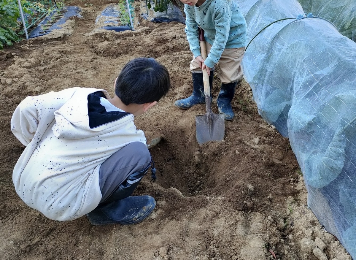スコップを持ってきて掘り上げると今度はスコップで遊ぶのが楽しくなって落とし穴を作っていました