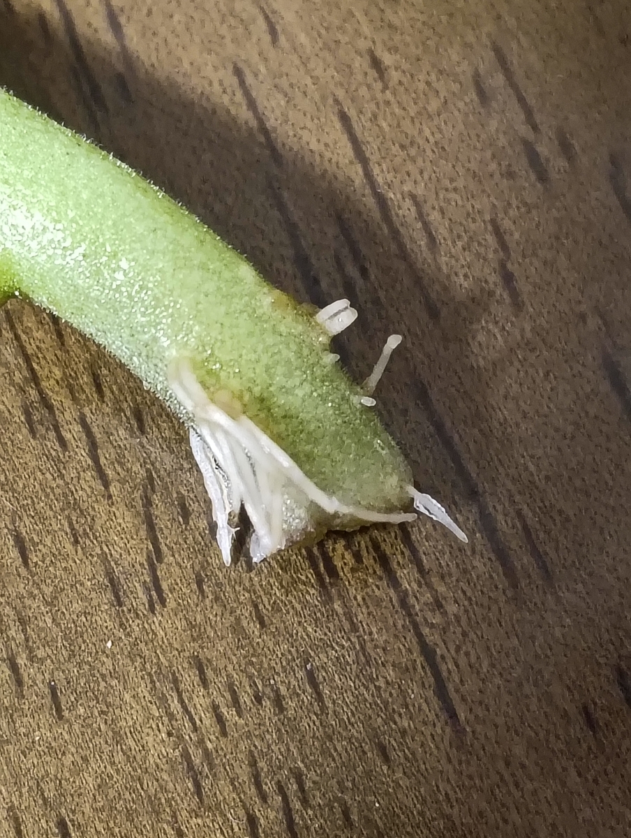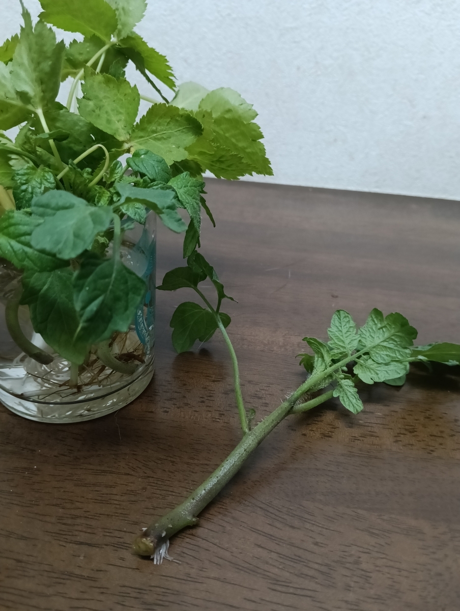 トマトの欠いた脇芽を水にさしていると根っこが出てきました