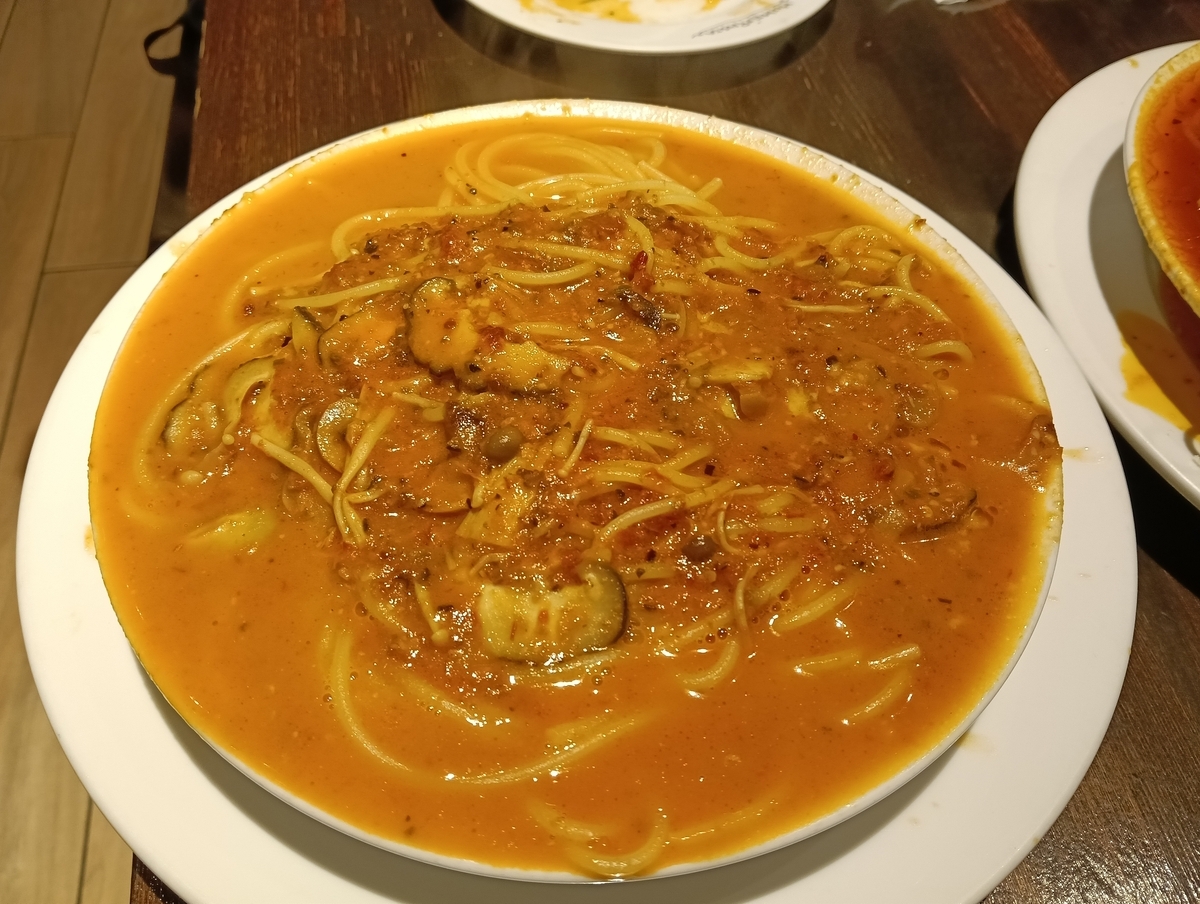 どちらも熱々のこぼれそうなソースたっぷりのスパゲッティ