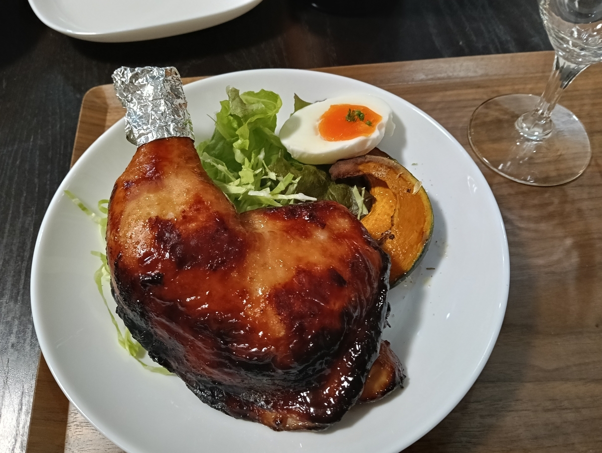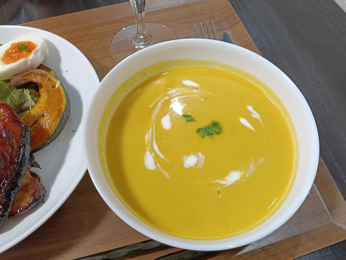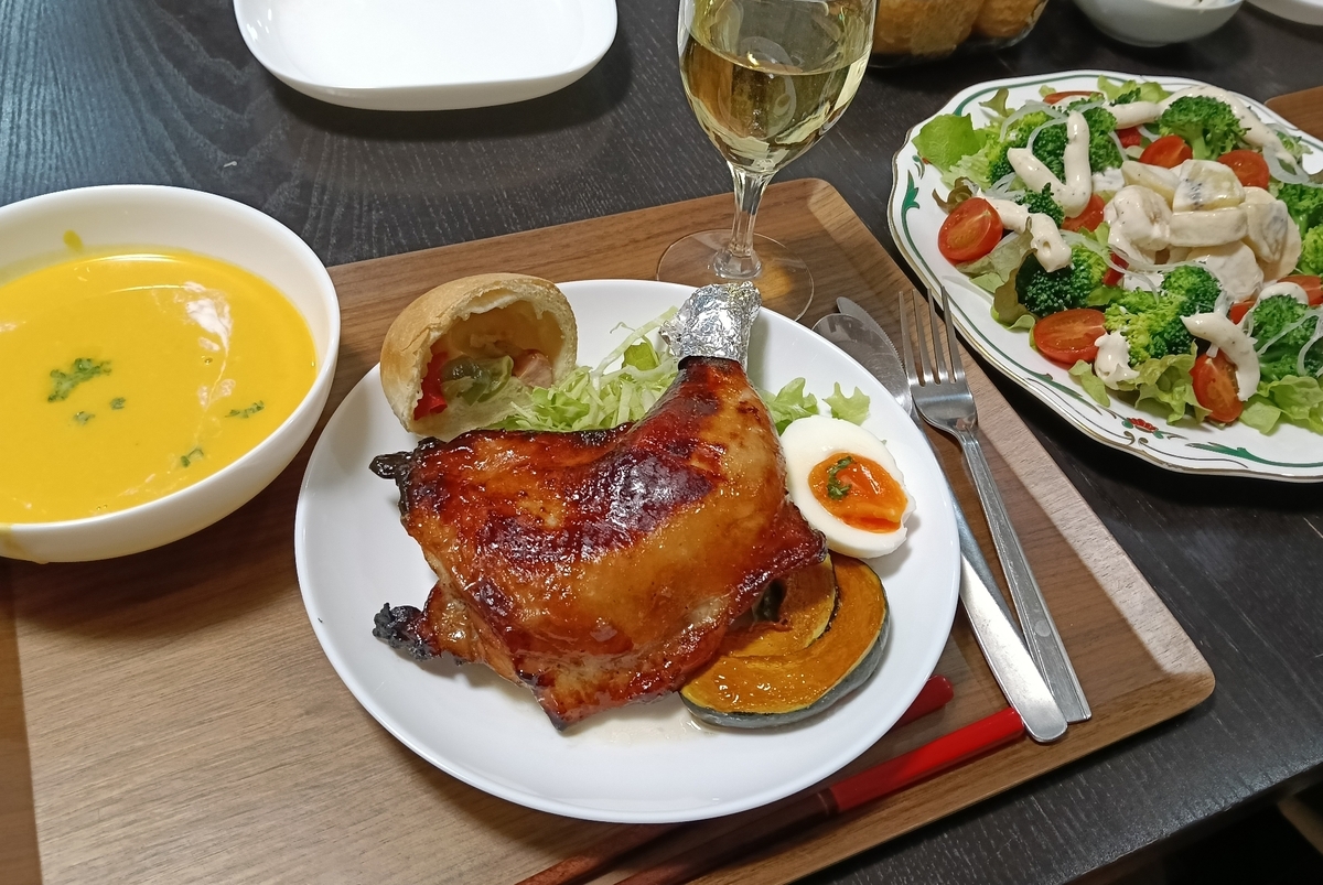 モモ肉は先日コストコで丸鶏をさばいたもの漬け込んでロースト、サラダでXmasリース風に、かぼちゃはブレンダーでつぶしてポタージュに、先日のパン教室で作ったパプリカとチーズのブールパンとワインで