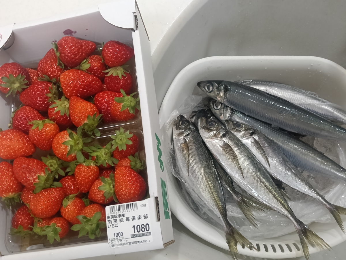 大きなうるめいわし(¥200×5)と鯵(¥100×10) 朝摘みいちごを買ってきました
